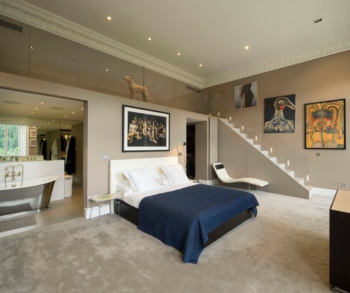 Contemporary Bedroom صورة غرفة نوم رئيسية واسعة بديكور معاصر، جدران رمادية وسجاد في لندن مع اضاءة سبوت لايتس ولوحات حائط أنيقة. Read more