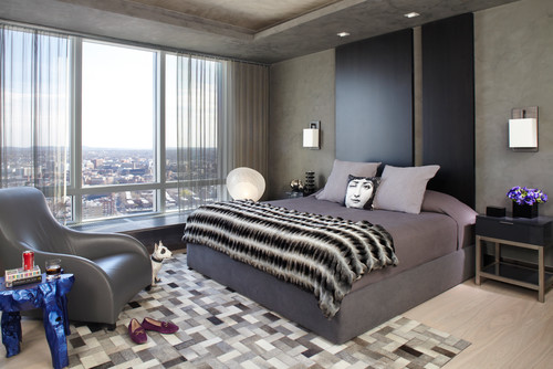 Contemporary Bedroom افكار تصميم غرفة نوم رئيسية بجدران رمادية وانارة سبوت لايت مع ارضية فاتحة من الخشب الصلب. Read more